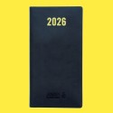 Format (9.5 × 18 cm), une semaine par double page, couverture souple en plastique, de décembre 2025 à décembre 2026, finition mate.
