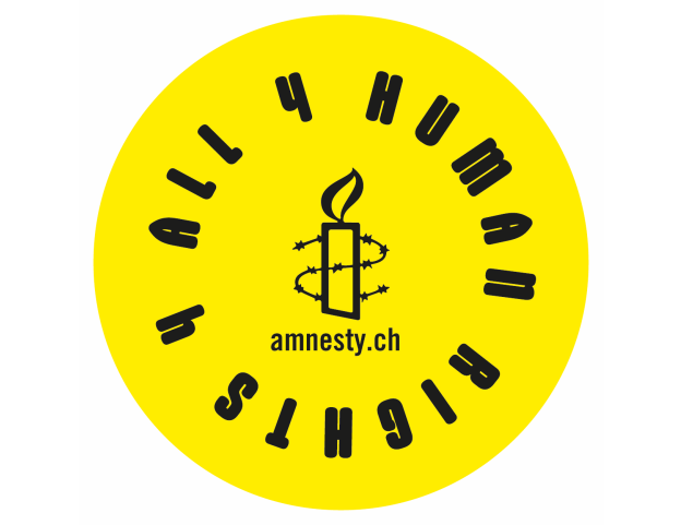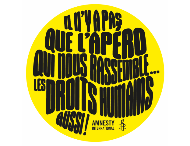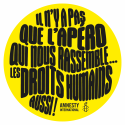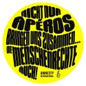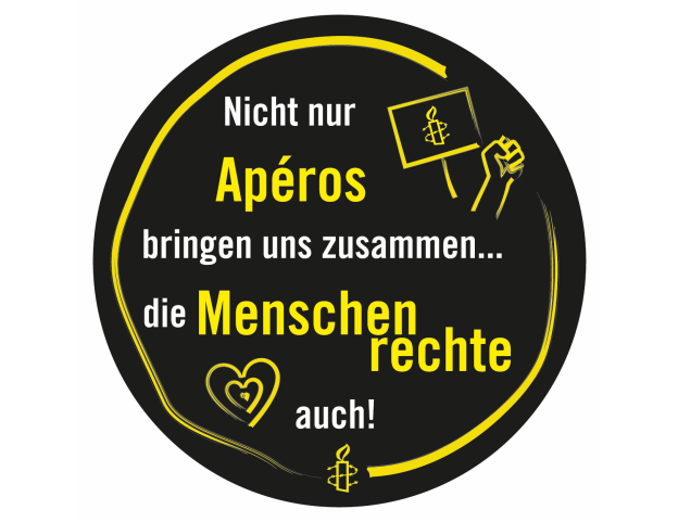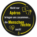 Bierdeckel (Durchmesser 107mm) mit dem Aufdruck «Nicht nur Apéros bringen uns zusammen…die Menschenrechte auch» in schwarz oder gelb.